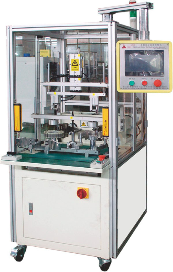 本機用于無刷電機外繞定子的自動繞線,更換工裝后可繞不同的電機定子,工作后可自動繞線,排線,分度,拉線入槽,自動剪線等動作,實現全自動繞線,排列整齊,繞線速度快,生產效率高。工業(yè)級人機界面,彩色觸摸屏操作。專業(yè)化界面設計,操作方便快捷。 嵌入式模塊化設計,功能強大,客戶可根據自己需求自行編程。以EEPROM存儲,最短保持十年。